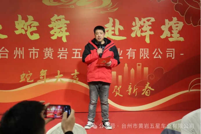 黃巖五星車業(yè)董事長(zhǎng)兼總經(jīng)理周正華先生致詞:總結(jié)一年來(lái)的風(fēng)風(fēng)雨雨,感謝每位員工的辛勤付出,展望新的一年,讓我們攜手共進(jìn),并祝福大家新春快樂(lè),身體健康!